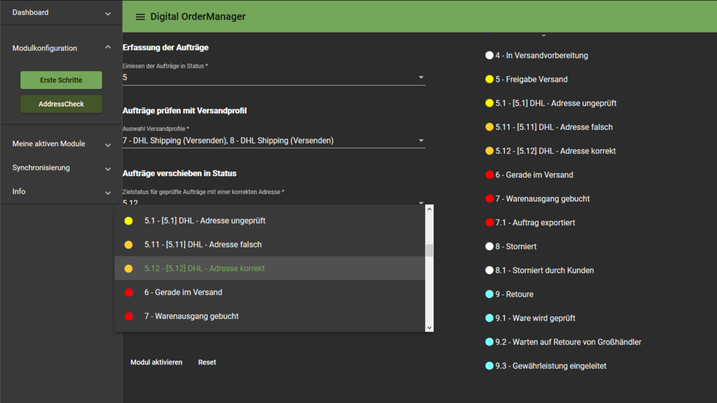 Zielstatus für geprüfte Aufträge mit einer korrekten Adresse, legt das Ziel für Aufträge fest die nicht durch die Validierung bemängelt werden und sollten (für den DHL Versand) unproblematisch sein.
